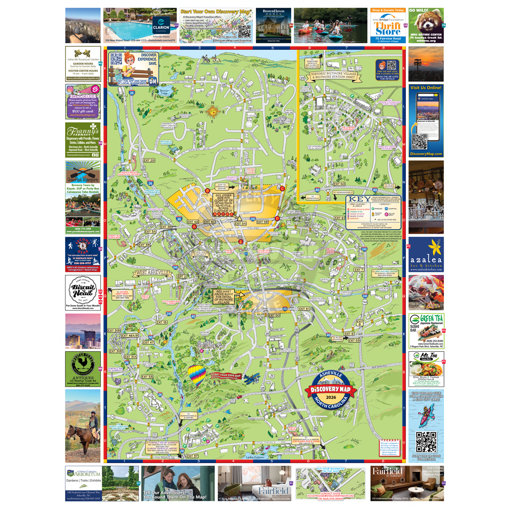 Illustrated Discovery Map of Asheville, NC. Folded