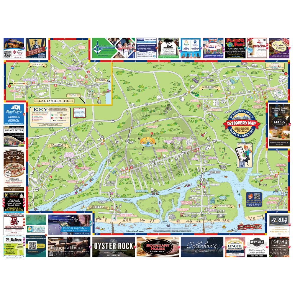 Illustrated Discovery Map of Brunswick County, NC featuring Calabash and Oak Island. Folded