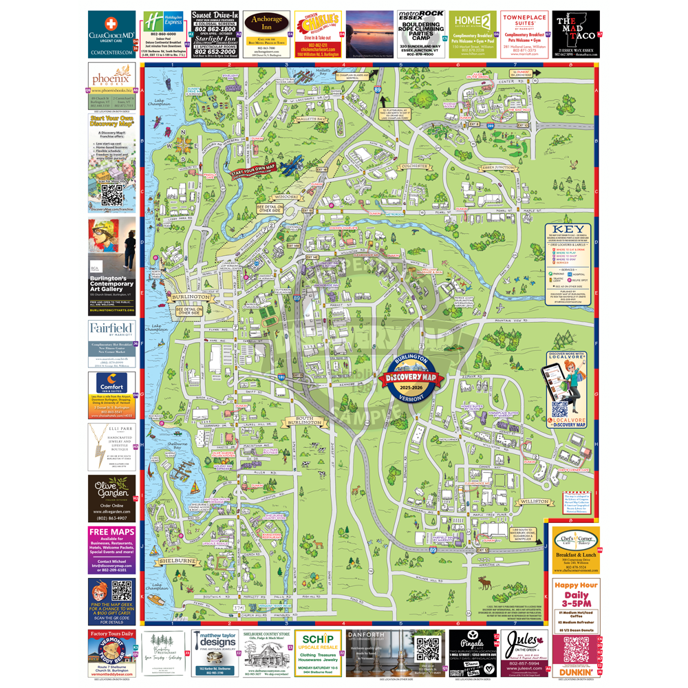 Illustrated Discovery Map of Burlington, VT. Folded