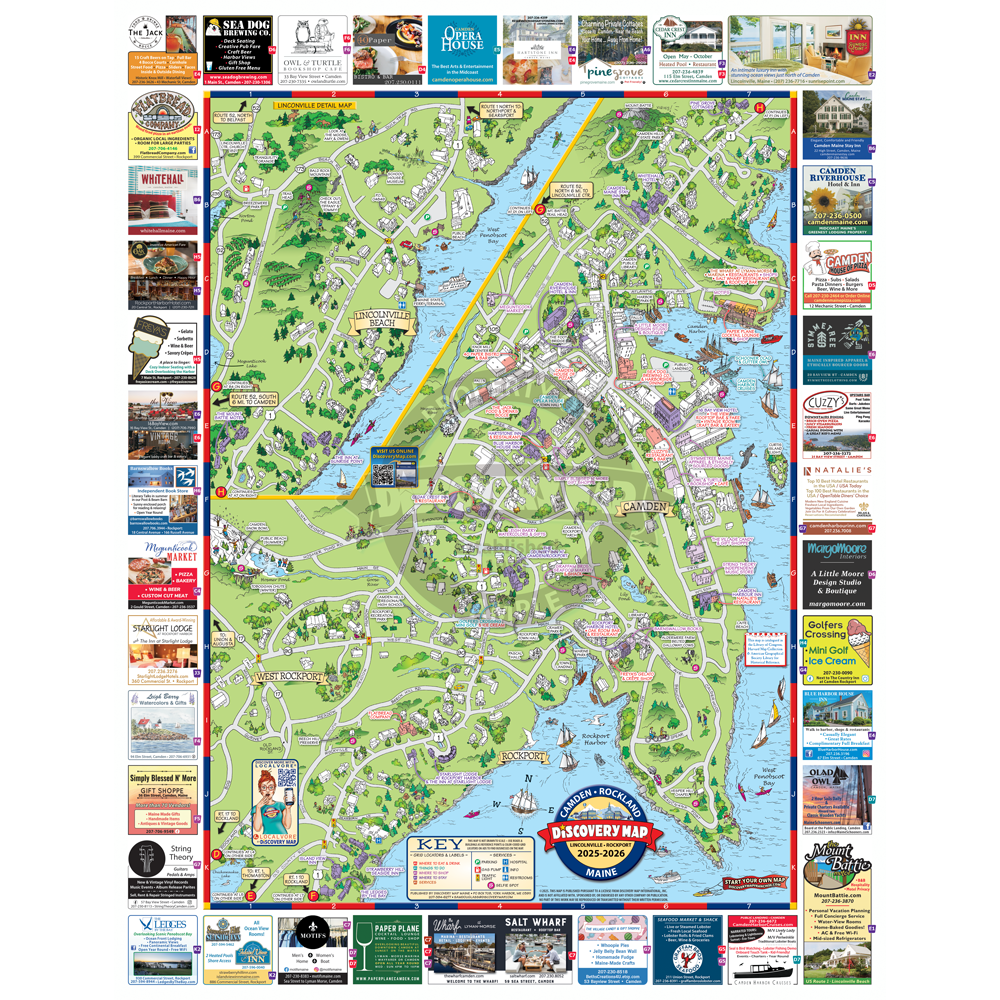 Illustrated Discovery Map of Camden and Rockland, ME. Folded