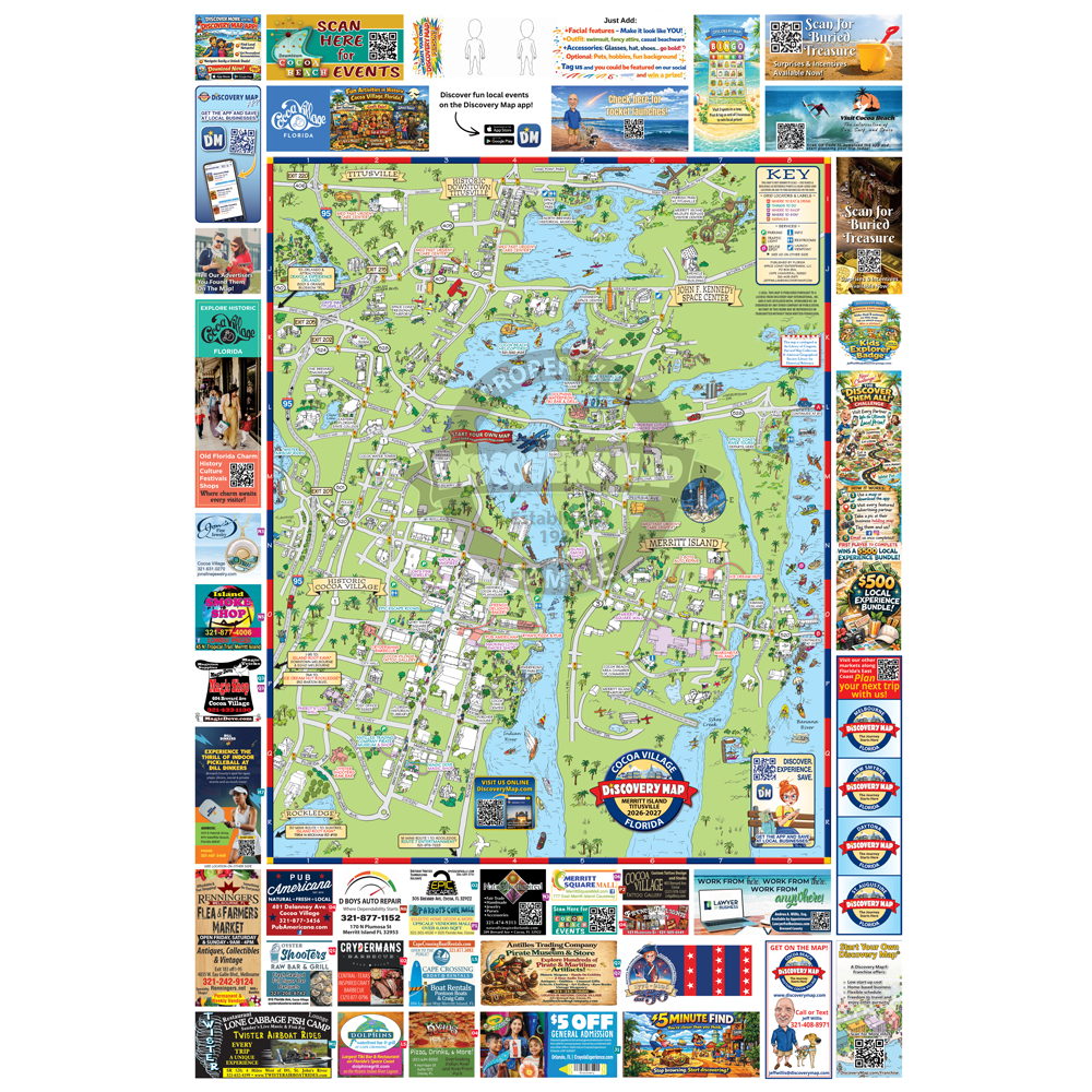 Illustrated Discovery Map of Cocoa Beach and Cocoa Village, FL. Folded