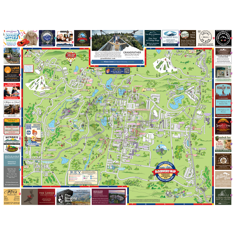 Illustrated Discovery Map of Boone and Blowing Rock, NC featuring the towns and attractions of the area.