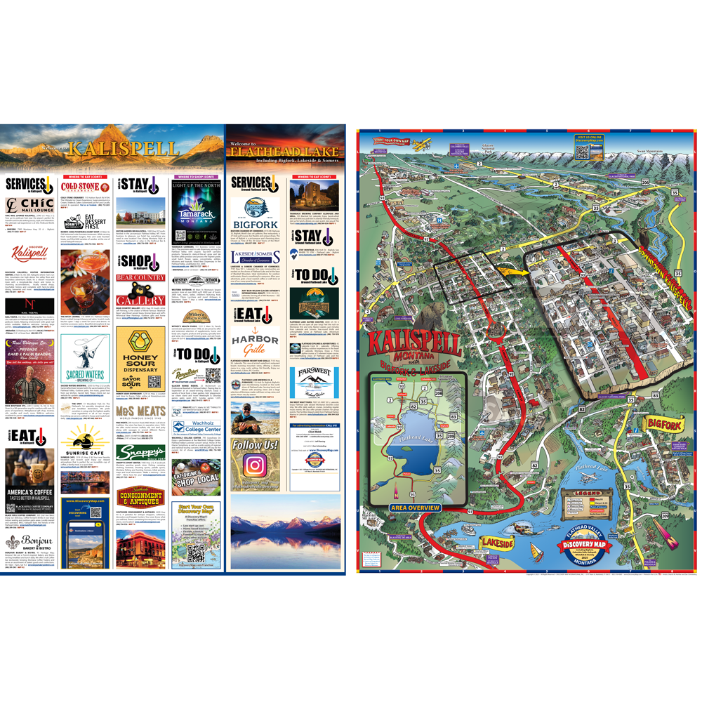 Illustrated Discovery Map of Flathead Valley, MT featuring Whitefish and Kalispell. Folded
