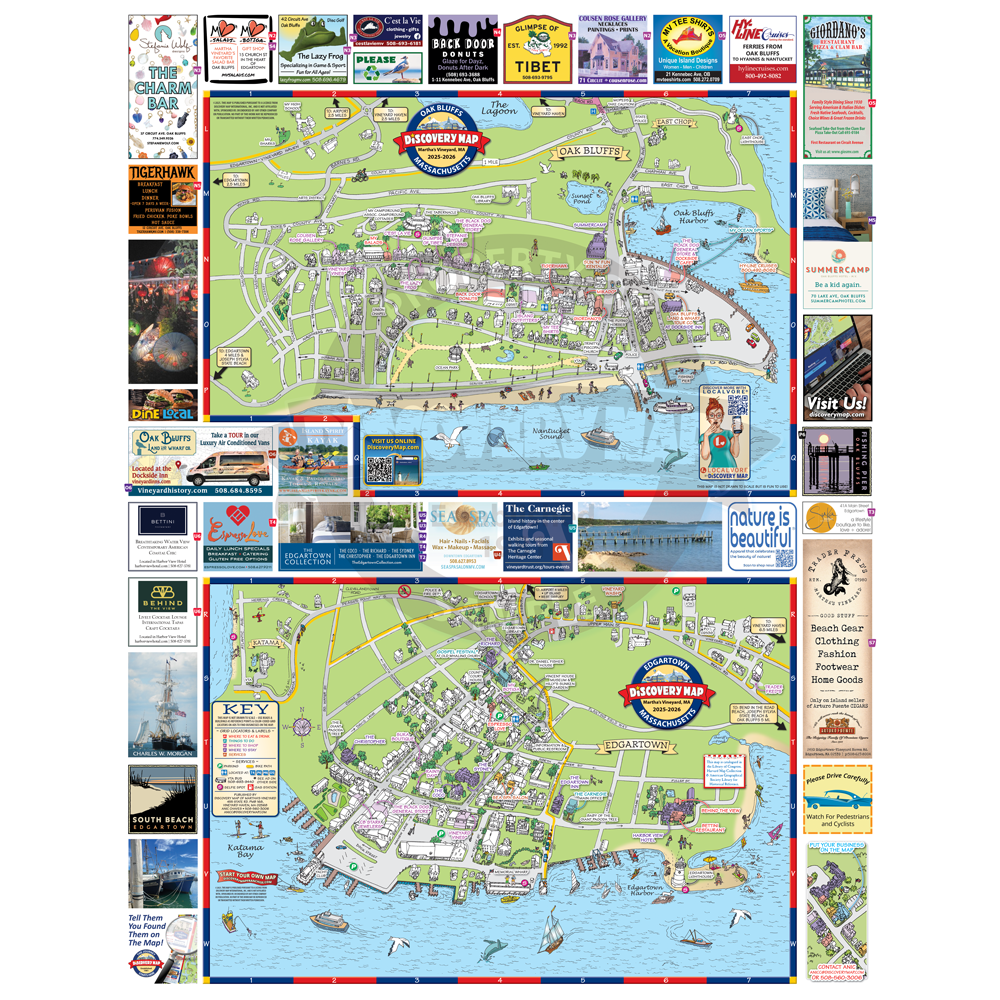 Illustrated Discovery Map of Martha’s Vineyard, MA featuring Edgartown, Oak Bluffs, Vineyard Haven. Folded