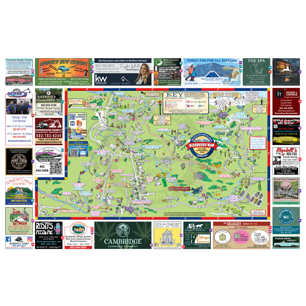 Illustrated Discovery Map of Smugglers’ Notch, VT, featuring Jeffersonville, Cambridge, Morrisville, Johnson. Folded